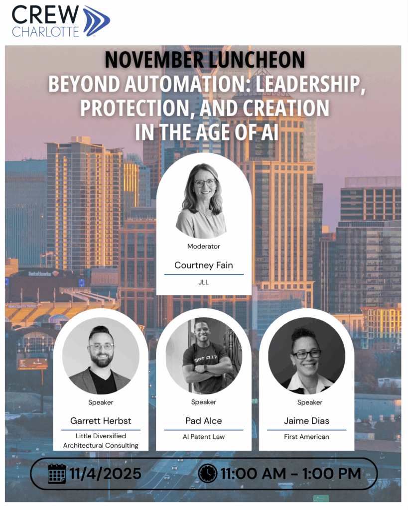 Join CREW Charlotte for a cutting-edge panel discussion that breaks through the AI hype to reveal game-changing strategies transforming today’s business landscape. Discover how artificial intelligence is disrupting traditional models and unlocking unprecedented opportunities across industries with revolutionary applications to commercial real estate. Our powerhouse panel features three visionary leaders who are driving the AI revolution and reshaping entire sectors.